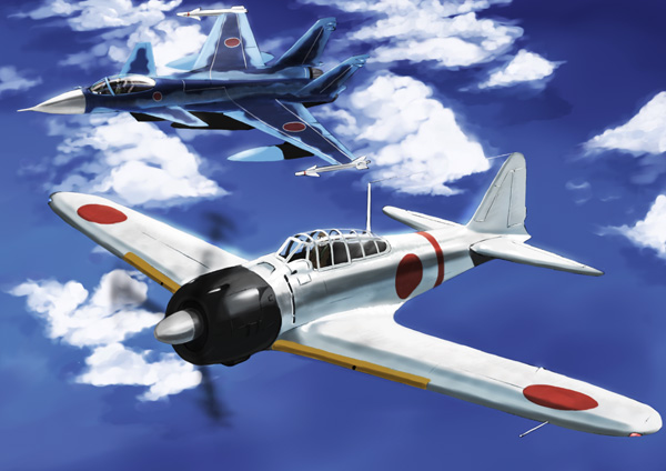 で、そんなノリで描いたのが↓の『零戦』、その隣に並んでいるのが米の横槍が入る前の『F-2』です。頑張れ、三菱重工!